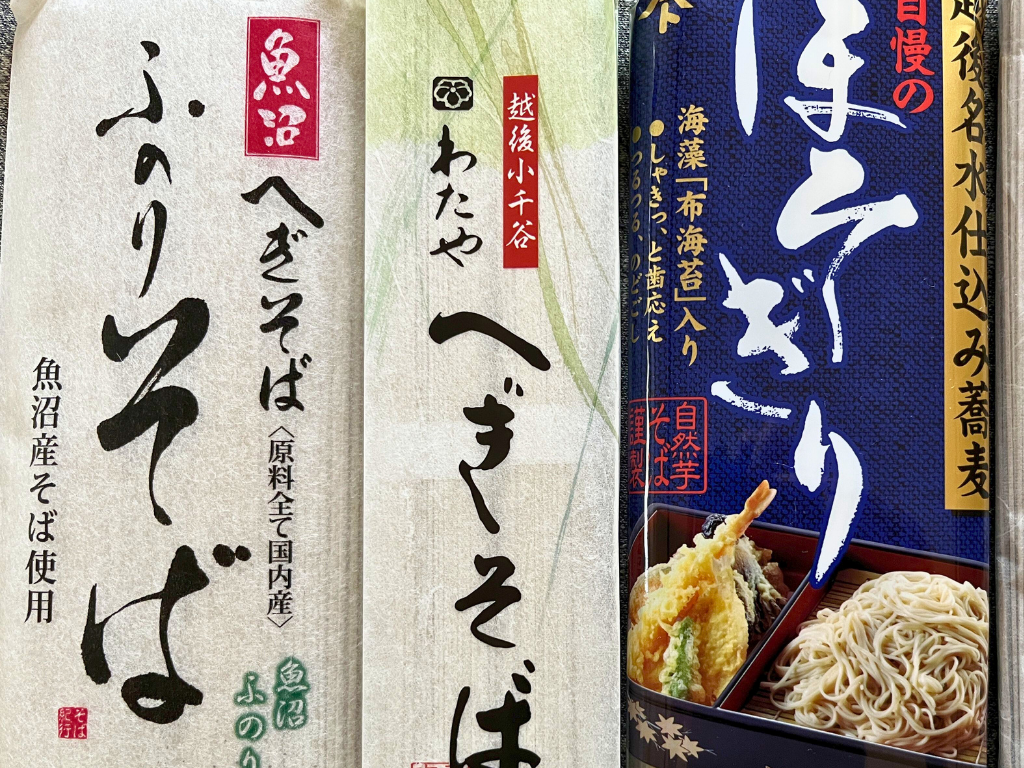 今回も様々な「へぎそば」をご家庭でも味わっていただけるよう、前回ご紹介できなかった新潟県内のスーパーで手に入る乾麺を購入してきました