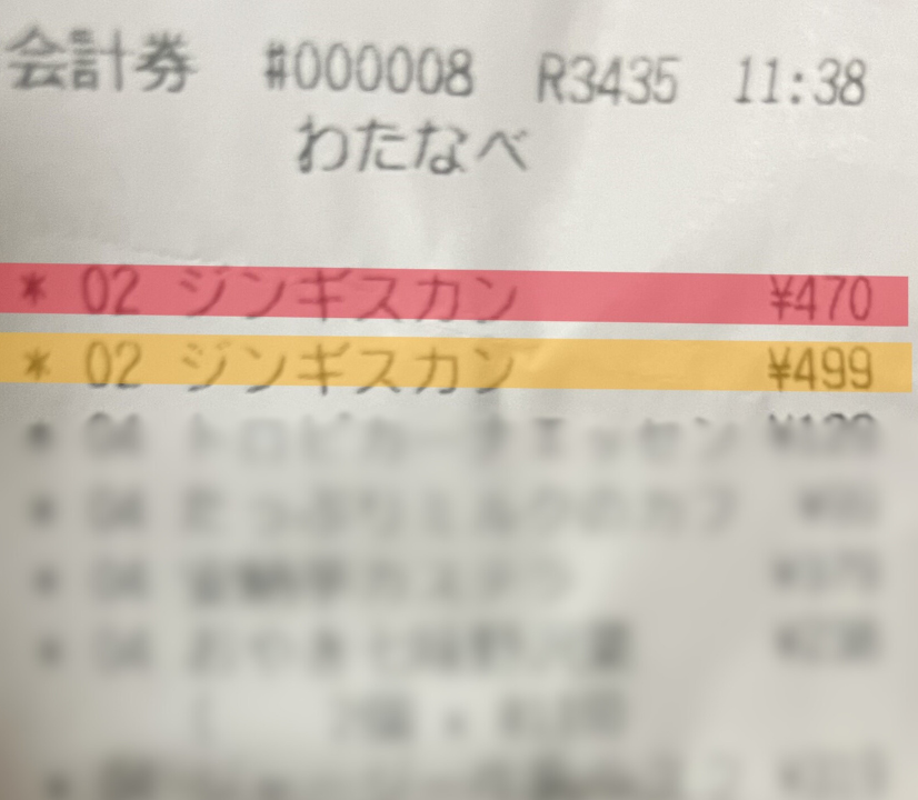 レシート上ではどちらも「ジンギスカン」としての表示しかされていなかったため詳しい値段がわかりませんがどちらかが、470円でもう一方が499円です。